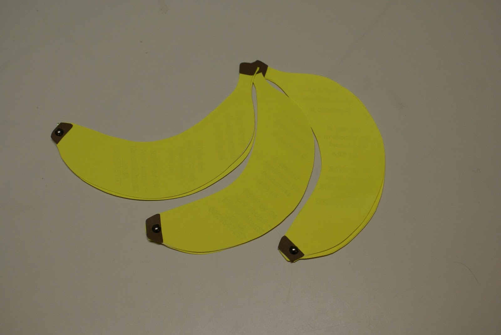 I made my banana invitations out of paper but later on saw on the internet that many people use felt to create the same idea. I cut a back and front jacket in the shape of a banana with the stem attached. Then I added two extra peels without the stem and I printed party information on these. The main party information was printed on light yellow card to represent the banana inside all the skin. I secured all the pieces together with a small paper fastener scissor pin. This allowed for the banana to be 'peeled' open and for the information to be revealed.